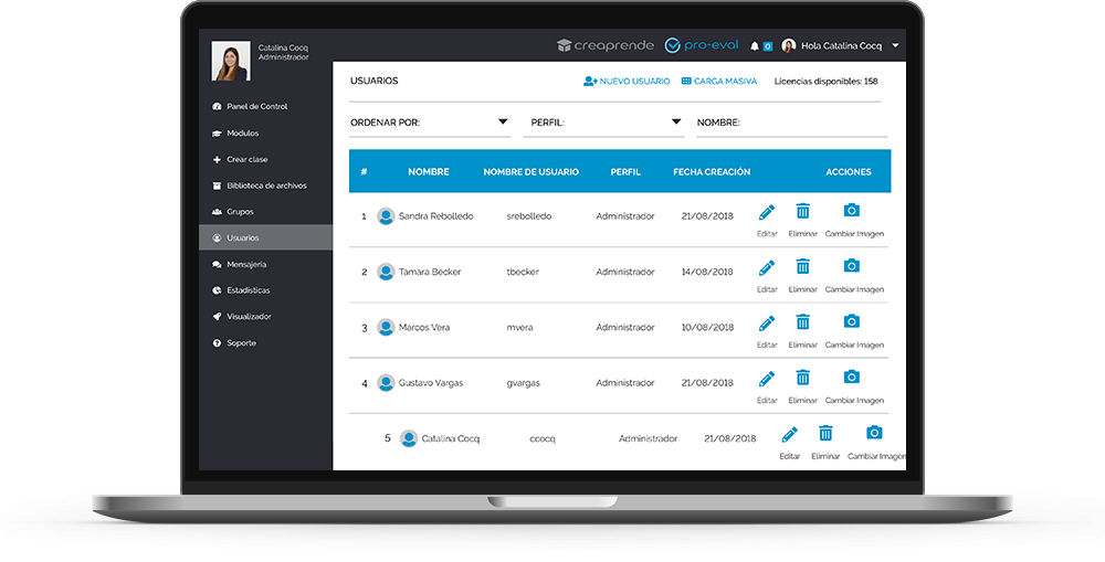 Los usuarios interactúan con la plataforma mediante perfiles de usuario, que permiten crear experiencias de aprendizaje, administrar y obtener resultados.